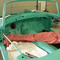 Den er total renoveret og ramme løftet men helt adskilt i mindste detalje, alt i nyt eller renoveret. Den er lakeret i original farve, lakeret i år 2001, samles nu på bestilling for kunde. |