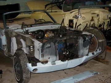 Karosseriet er ved at blive gjort klar til lak, har bla andet fået skiftet venstre bagskærm,en ny hjelm og to nye forskærme, delene er fabriksnye, vognen har delvis nyt enteriør, bla nyt korrekt sædebetræk på forstole,gulvtæppe mm og alt trim på vognen er nyt,der kan nævnes kofanger-chrom-lygter-emblemer, så det er en vogn der vil fremstå fint overalt efter samling og desuden kan nævnes at alle bolte-beslag-dørlåse og andre ting er blevet el-galvaniseret i de originale farve i henholdsvis gul-sort-blå(grå) og det meste gummi er nyt eller godt med nyt enteriør i bagagerum.